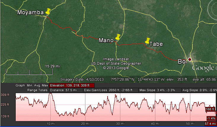 The railway was overgrown after Mano and I followed a good dirt road through rolling hills. I happened upon the district counsellor for the area and he gave me his number and pledged to order the path brushed (machete'd) whenever I should say the word. In Mogbaseke, I met the man who had moved into the old station house soon after the trains stopped in '73 and had lived there ever since. A few miles further, after Mokaba, the trail was again too bushy to ride and I had to make a lengthy detour downhill and in roughly the opposite direction. I passed through a bog replete with wildlife; several thin maroon rodents raced across the road and a zebra-striped bird with a long flowing black tail briefly hung suspended in the air before me. The only available alternative is a new super-highway where cars and okadas hurtle through at slightly insane speeds, spraying up dust and rocks and diesel fumes. In the 3 mile stretch, I would see 5 cars – this was 5 more than passed by in the remaining 54. This was a sad testament to the effect of development on Salone's fantastic hiking and biking treasures. I would have to act fast.